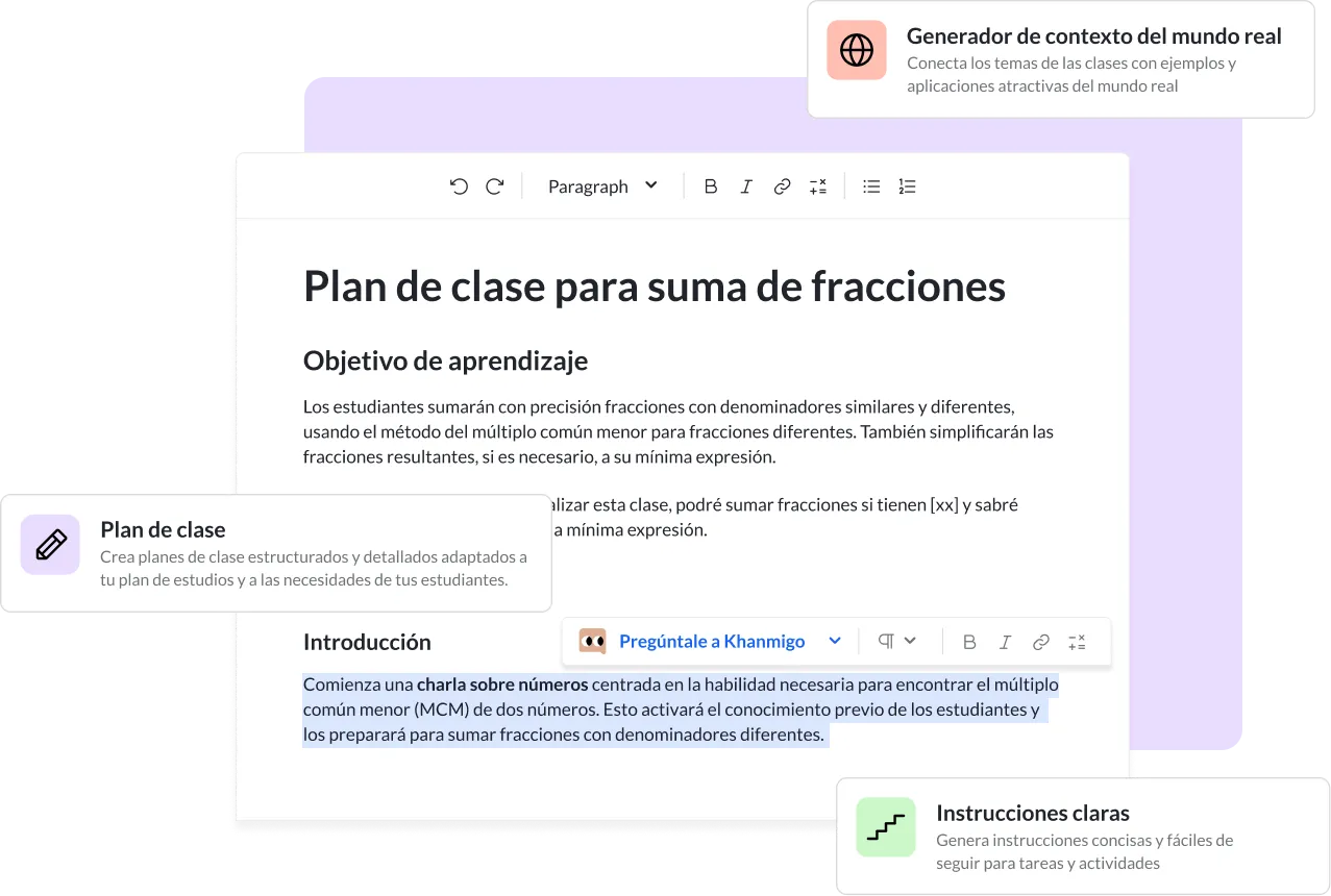 Khanmigo hace que planificar tu semana y preparar las sesiones sea fácil con un conjunto de herramientas adaptadas a la forma en que enseñas.