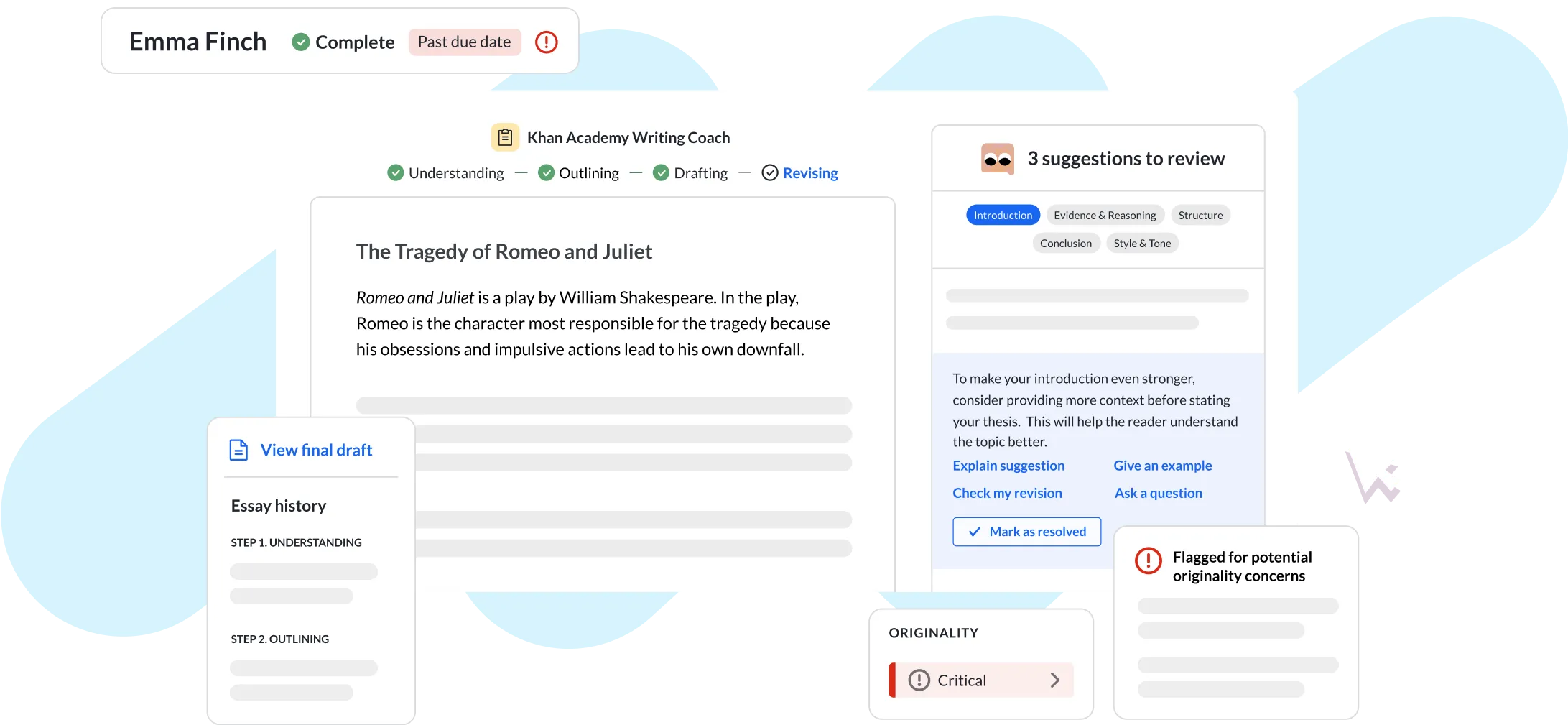 Designed by teachers, Khan Academy Writing Coach uses AI to make essay writing a dynamic, interactive experience—providing students with step-by-step guidance and teachers with actionable insights.