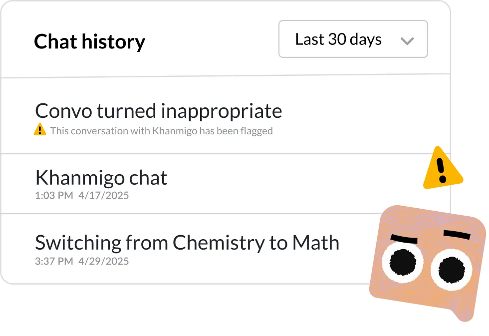 Khanmigo is built for learners, with guardrails and monitoring in place. You can view your child’s chats, get alerts for flagged content, and feel good knowing they’re using an AI designed specifically for learning.