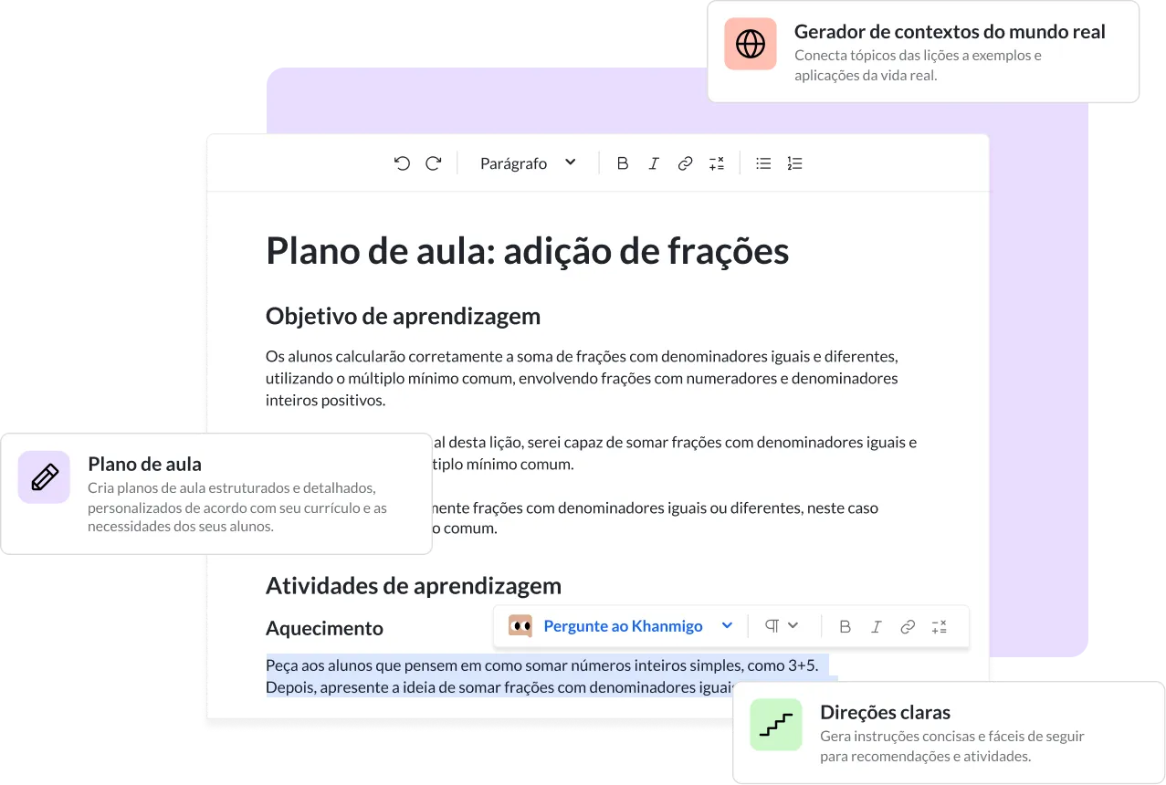 Menos tempo preparando materiais e mais tempo com os alunos. Agora o Khanmigo é 100% grátis.